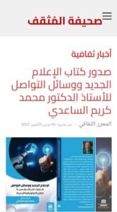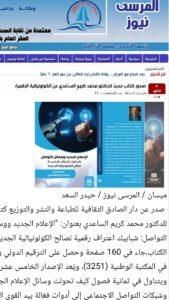 صحيفة الراصد العراقية تتناول خبر صدور كتاب الإعلام الجديد أداة للكولونيالية الرقمية للدكتور محمد كريم الساعدي