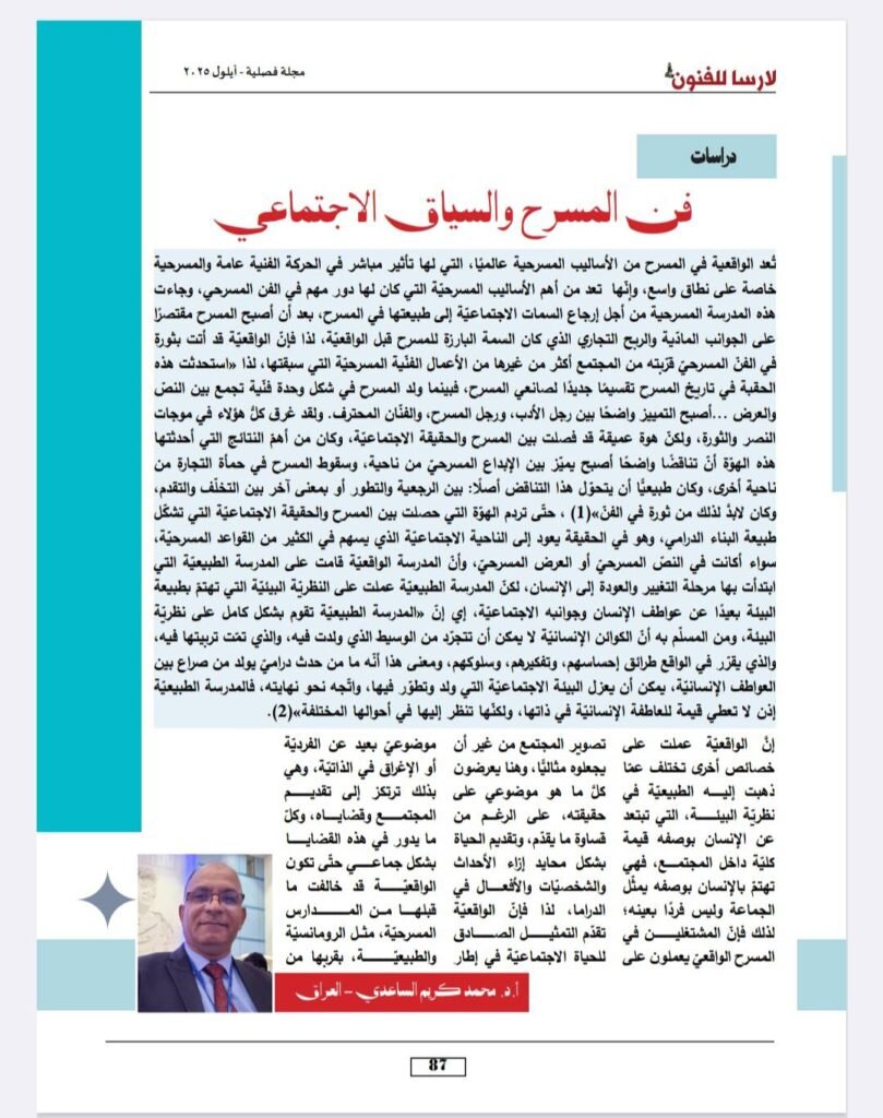 نشرت مجلة لارسا للفنون في عددها الجديد الصادر من الجامعة الأفروأسيوية كلية الفنون الجميلة مقالاً للأستاذ الدكتور محمد كريم الساعدي