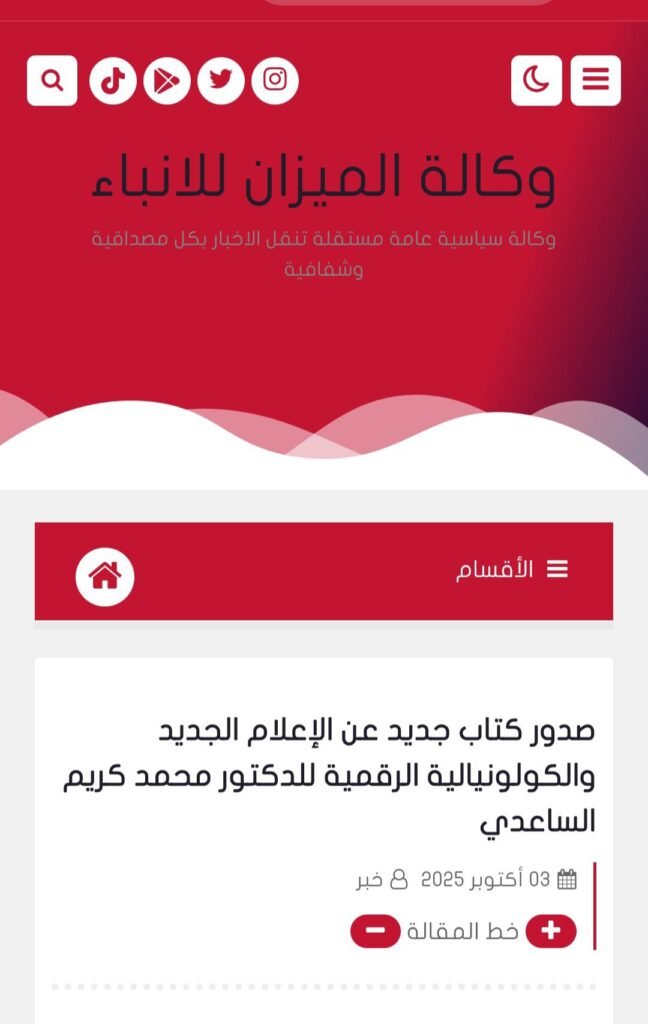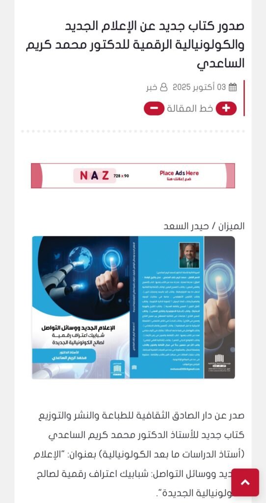 صدر عن دار الصادق الثقافية للطباعة والنشر والتوزيع كتاب جديد للدكتور محمد كريم الساعدي بعنوان: “الإعلام الجديد ووسائل التواصل: شبابيك اعتراف رقمية لصالح الكولونيالية الجديدة”.